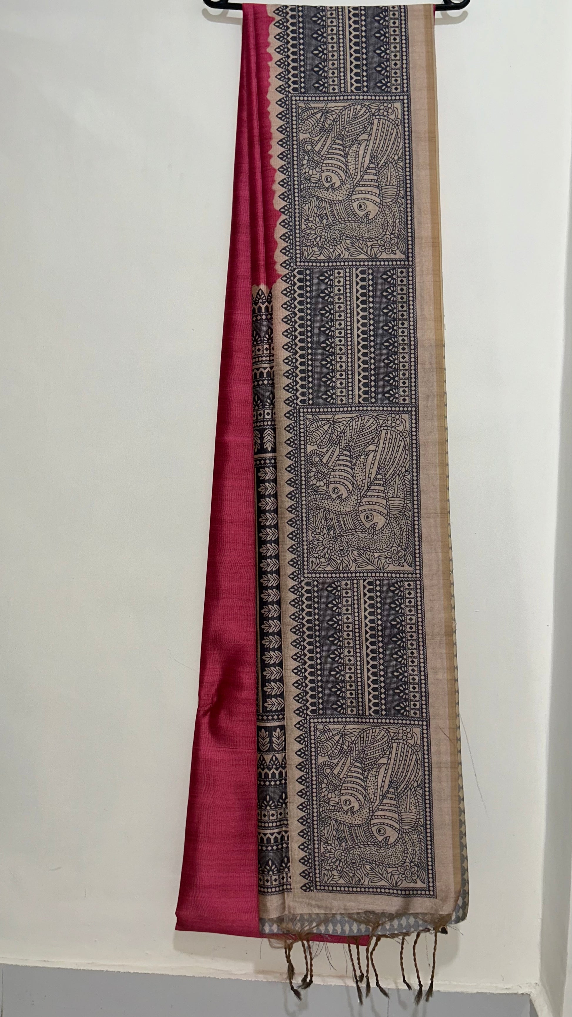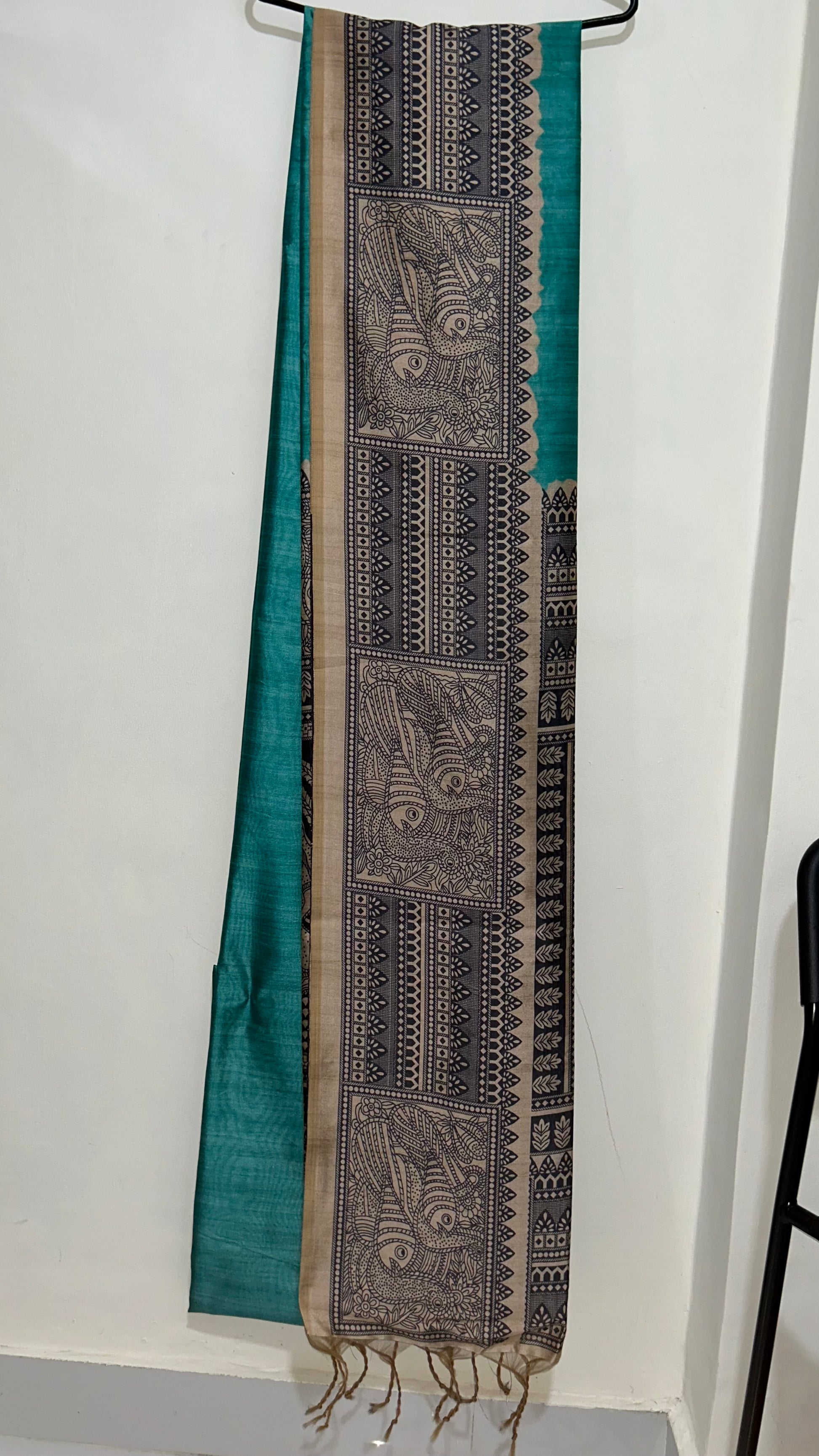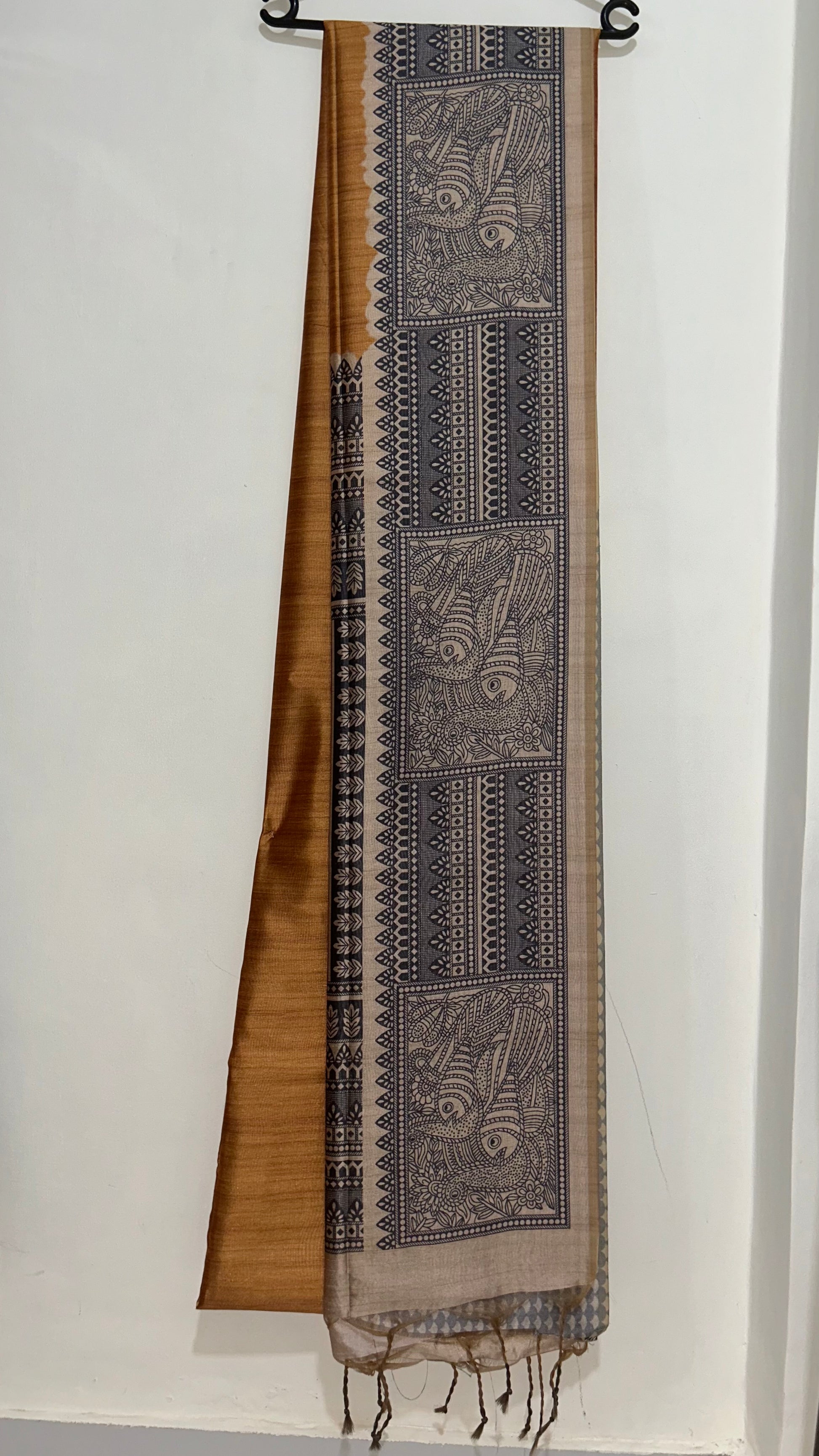 Step into timeless elegance with this stunning Tussar Silk Saree adorned with traditional Madhubani printed artwork. Handcrafted with inspiration from the rich cultural tapestry of Mithila, the saree features intricate folk motifs—peacocks, lotuses, fish, and divine symbols—beautifully arranged along the pallu and border. The natural golden hue of Tussar silk adds a rustic charm, making this saree a perfect fusion of heritage and sophistication.